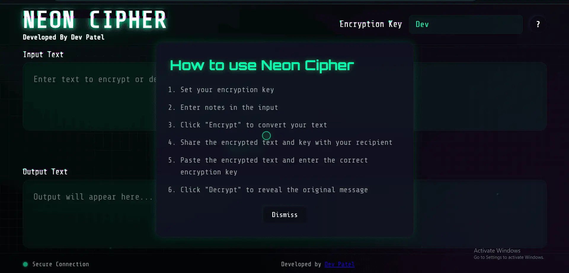 Neon Cipher is a lightweight text encryption and decryption tool designed for secure communication. Built with a glowing neon-inspired UI, it allows users to lock their messages using a custom key and share them safely. With its simple interface, users can easily encrypt sensitive text, share it, and decrypt it using the same keyโmaking privacy accessible to everyone.